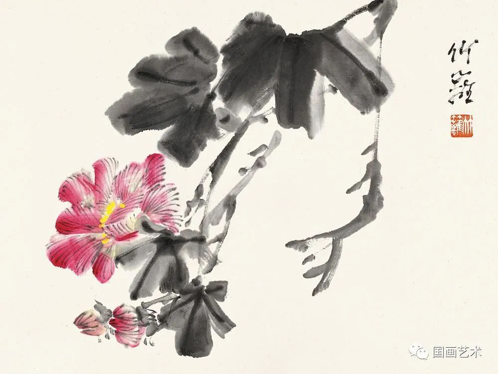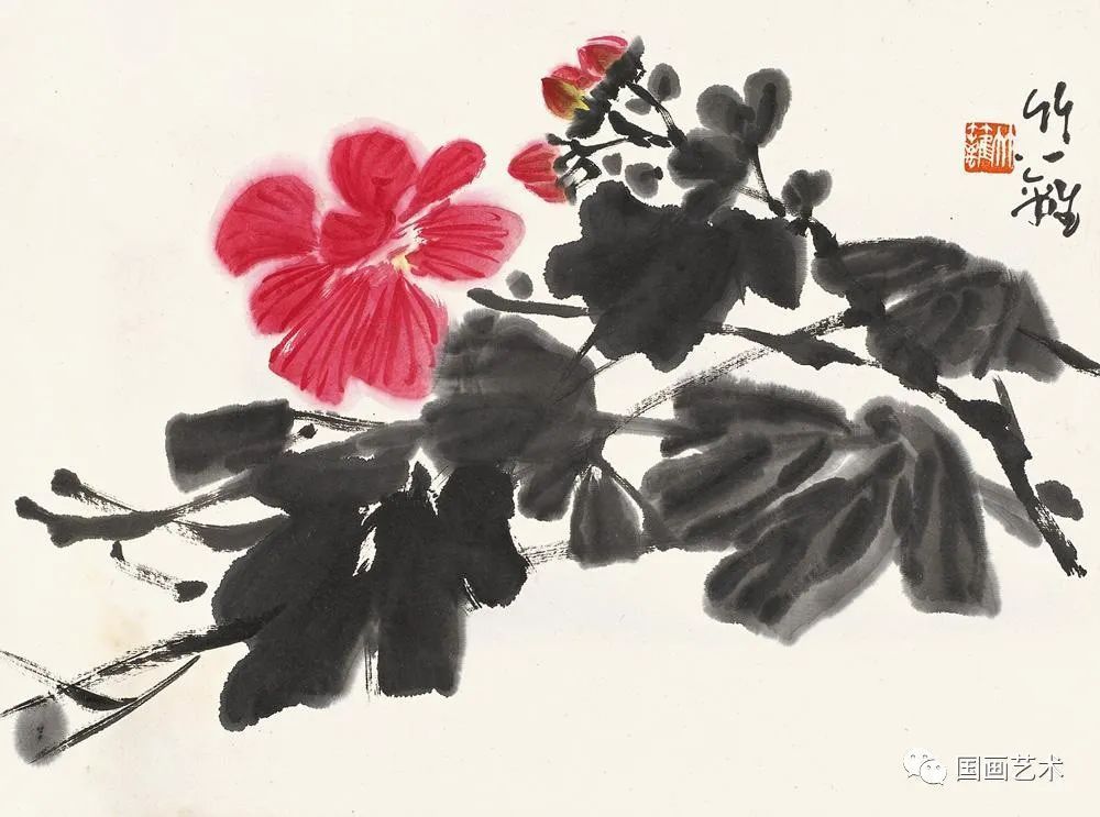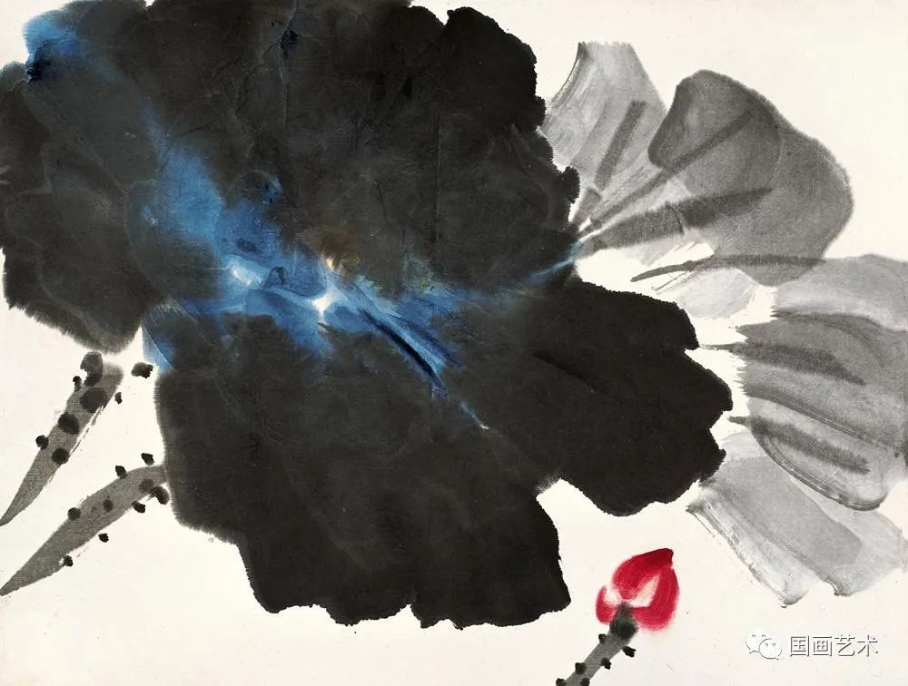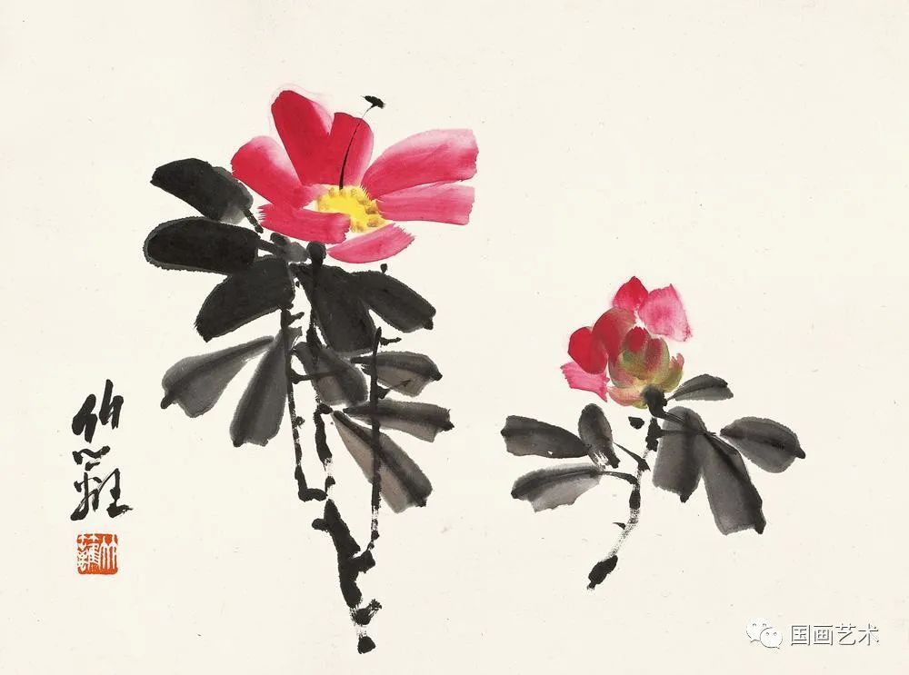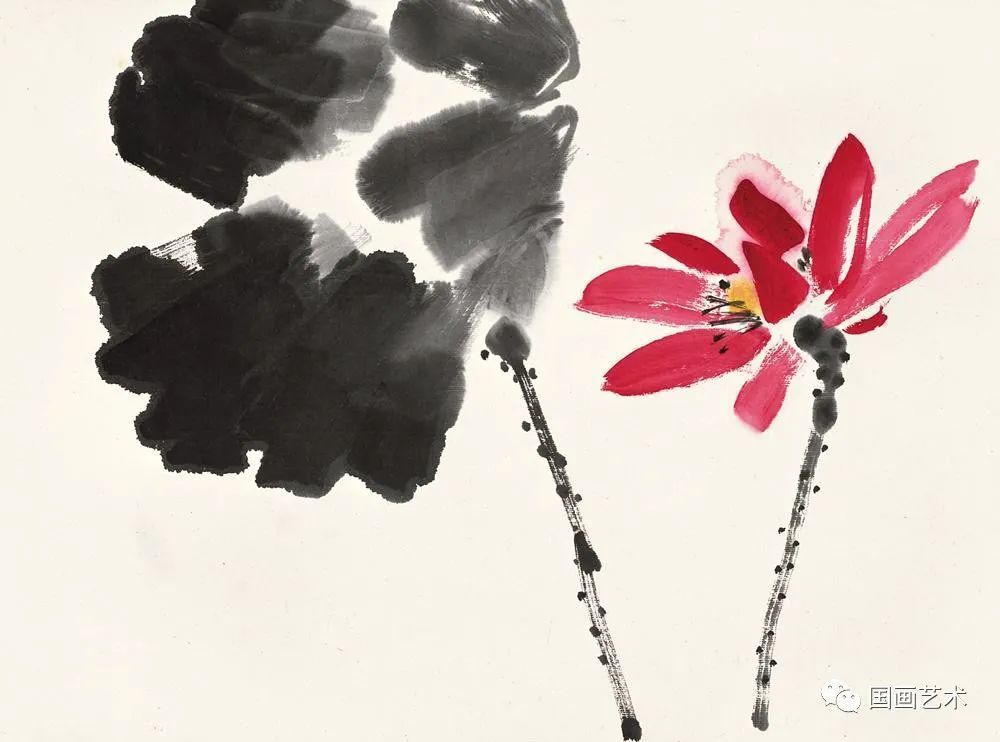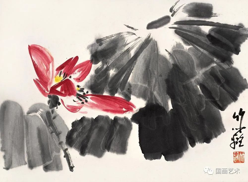 荷花是孙老又一酷爱的题材。荷花从春、夏、秋、冬各显其风采,写其自然,达到溢情于画是孙老的心意。我们看到他的荷花是:春天初荷时,鱼儿畅游;夏荷蓬勃生机,水鸟兴奋;秋荷叶黄,莲蓬累累;冬荷寓新生,清塘倒影,可谓寓诗寓情。孙老数十年画荷,风里、雨里、酷日、清晨、落日他都亲临野塘观察写生,寄于荷花无限之情。并有诗云:“十年看藕叶,八载忆潇湘。风雨催诗兴,丹青醉酒狂。”他画大写意荷花,兴酣落墨,即情挥洒,如疾风骤雨,花叶飘摇。他在用笔上以书法写荷茎,在画荷叶时又是大笔狂写,浓淡干湿淋漓尽致,处处都见笔墨精神。百开册中有荷花8帧,多是逸笔草草而写之。从构图看,多为简约,但饱含着对荷花的心意,写出了荷花出淤泥而不染的贞洁。一叶一花在画的构图中有着奇特的照应,也可谓阴阳相谐,浑然天成。