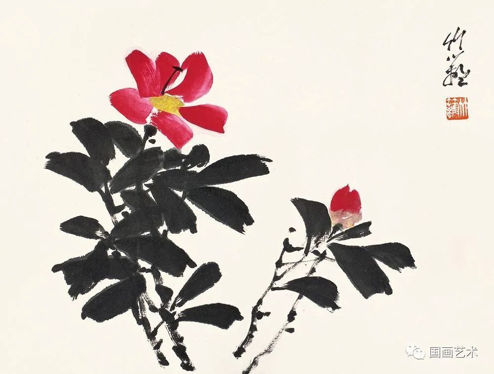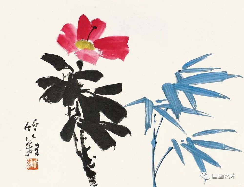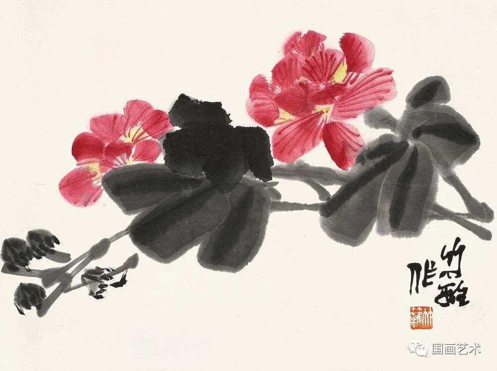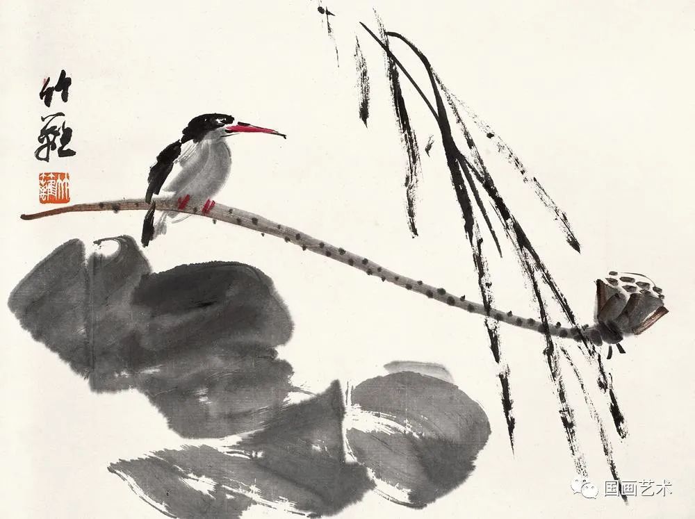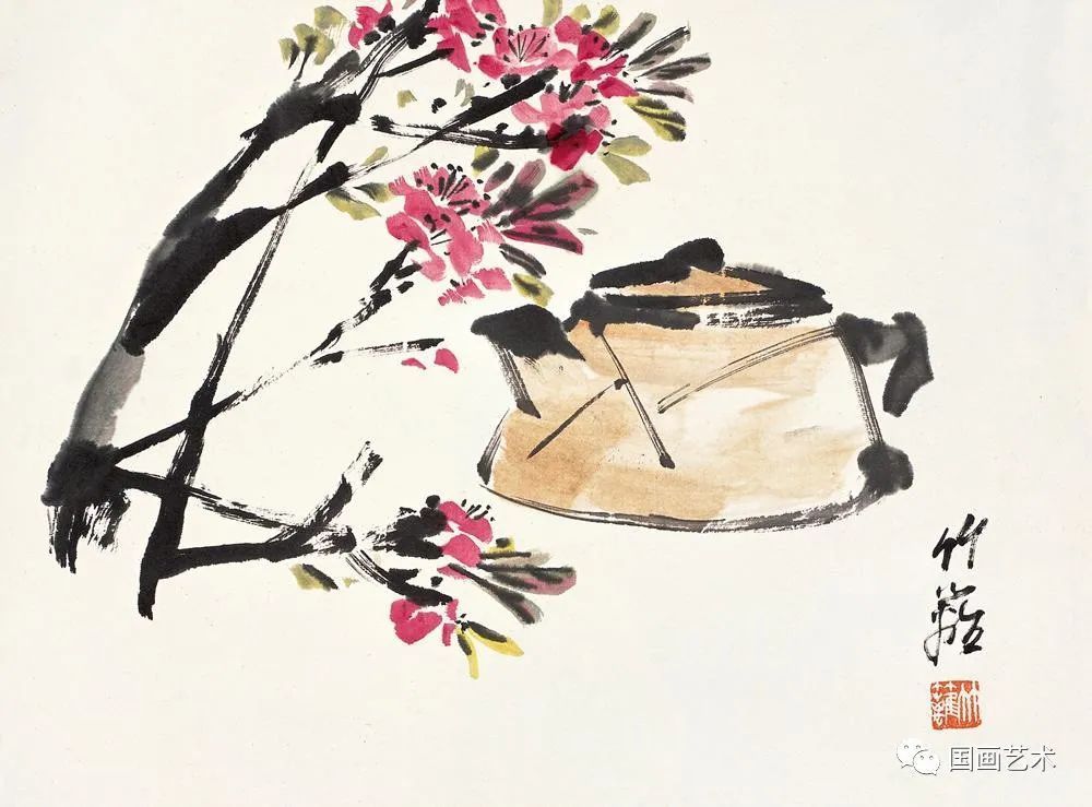 荷花是孙老又一酷爱的题材。荷花从春、夏、秋、冬各显其风采,写其自然,达到溢情于画是孙老的心意。我们看到他的荷花是:春天初荷时,鱼儿畅游;夏荷蓬勃生机,水鸟兴奋;秋荷叶黄,莲蓬累累;冬荷寓新生,清塘倒影,可谓寓诗寓情。孙老数十年画荷,风里、雨里、酷日、清晨、落日他都亲临野塘观察写生,寄于荷花无限之情。并有诗云:“十年看藕叶,八载忆潇湘。风雨催诗兴,丹青醉酒狂。”他画大写意荷花,兴酣落墨,即情挥洒,如疾风骤雨,花叶飘摇。他在用笔上以书法写荷茎,在画荷叶时又是大笔狂写,浓淡干湿淋漓尽致,处处都见笔墨精神。百开册中有荷花8帧,多是逸笔草草而写之。从构图看,多为简约,但饱含着对荷花的心意,写出了荷花出淤泥而不染的贞洁。一叶一花在画的构图中有着奇特的照应,也可谓阴阳相谐,浑然天成。